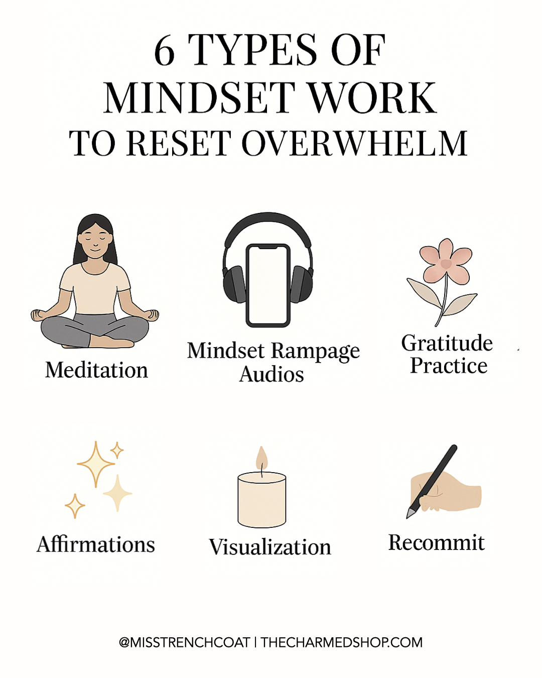 Mindset work: Journaling, affirmations, or meditation to align your thoughts for the day.