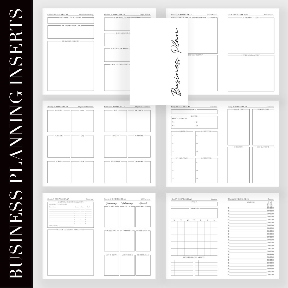 I designed this planner first and foremost, for myself, out of a need for structure to keep myself focused on my business goals and objectives. As a lover of paper planners, who works via the power of digital media, I needed dedicated inserts with enough structure to allow me to outline all my essential business objectives, marketing activities, and financial tracking into one streamlined business plan on paper before I then executed on the work on my computer.