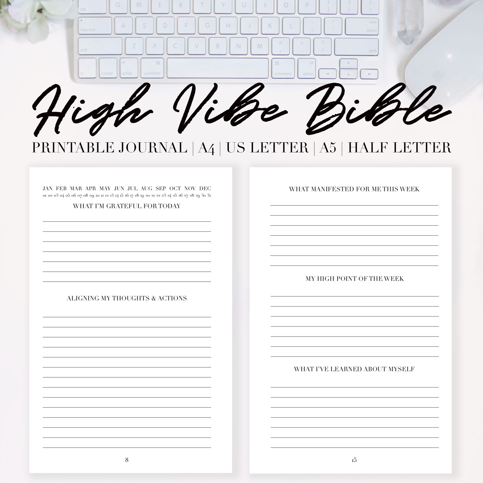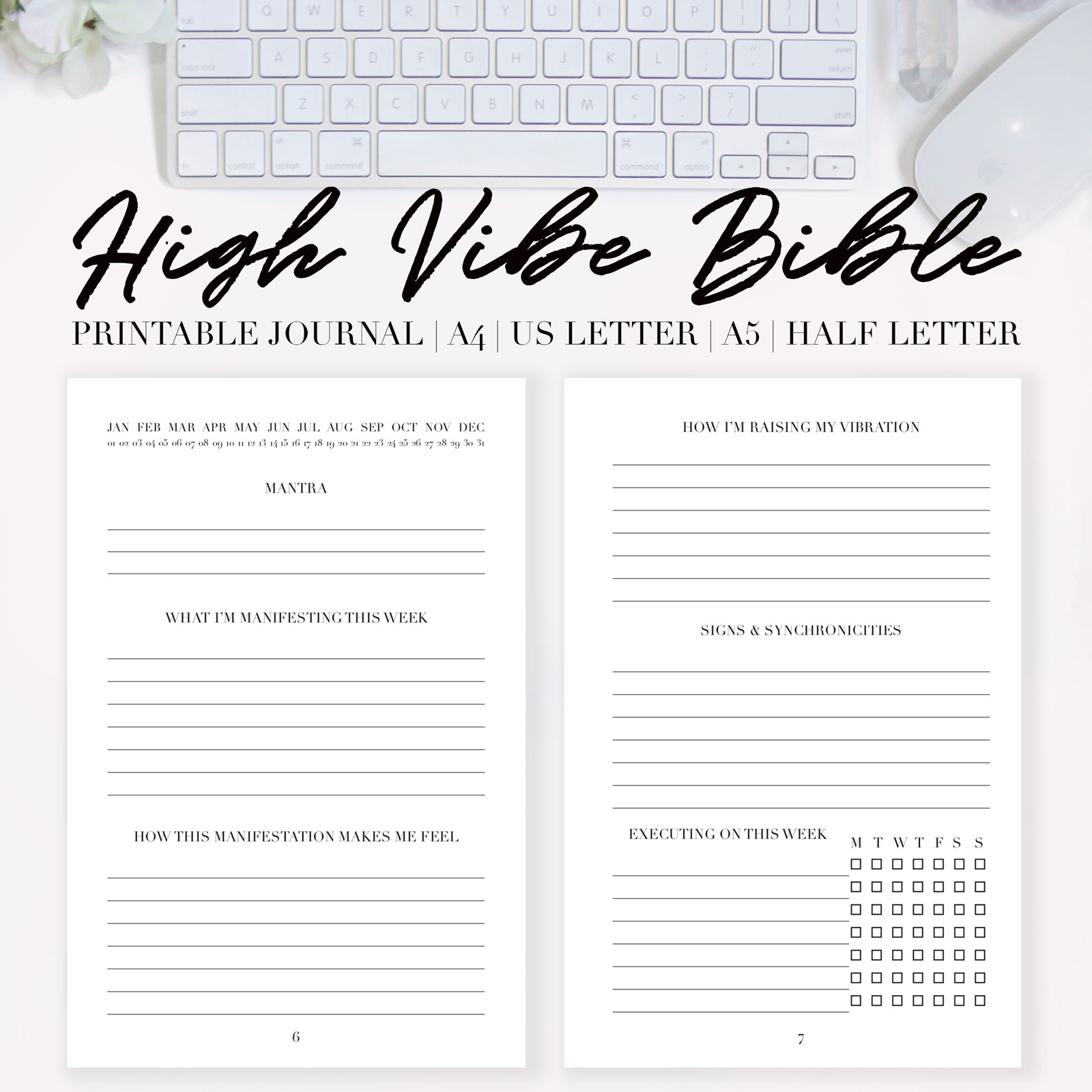 The HIGH VIBE BIBLE was intentionally designed to help you raise your vibration and manifest your desires over the course of 90 days or roughly three months. One part journal, one part manifestation tool, the High Vibe Bible is a loosely guided journaling experience intended to help you get super clear on what you want to achieve or receive, and then help you align your thoughts and actions to make it a reality.